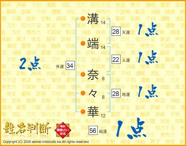 溝(14画)端(14画) 奈(8画)々(8画)華(12画)