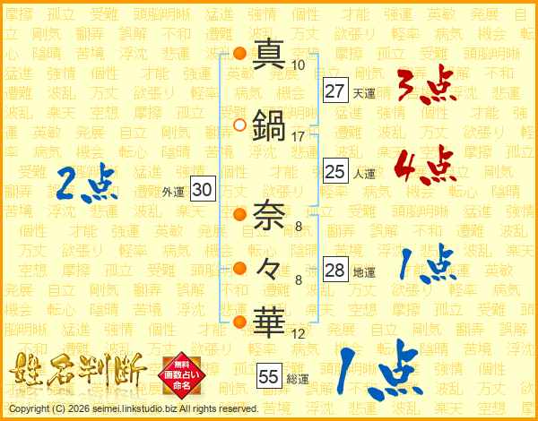 真(10画)鍋(17画) 奈(8画)々(8画)華(12画)