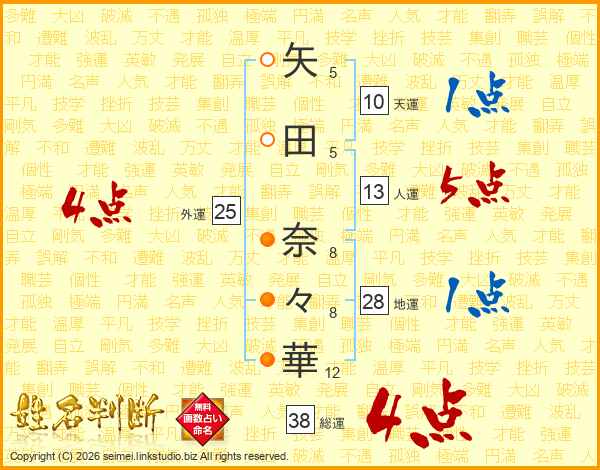 矢(5画)田(5画) 奈(8画)々(8画)華(12画)