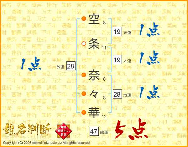 空(8画)条(11画) 奈(8画)々(8画)華(12画)