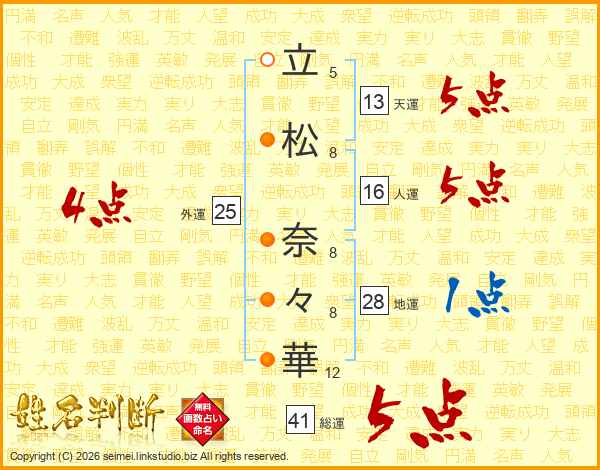 立(5画)松(8画) 奈(8画)々(8画)華(12画)