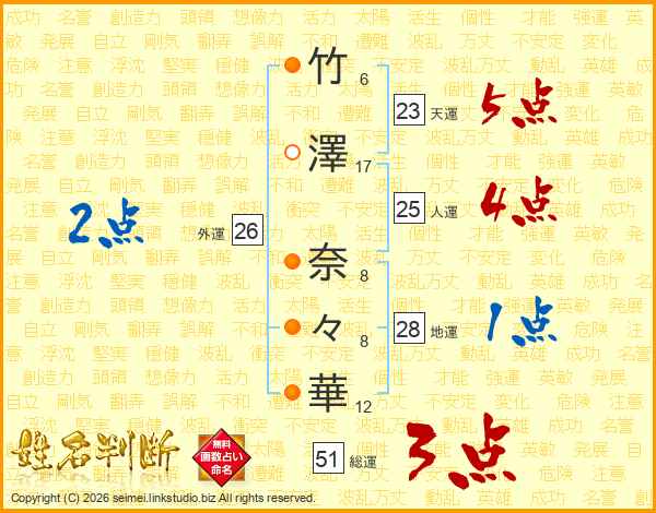 竹(6画)澤(17画) 奈(8画)々(8画)華(12画)
