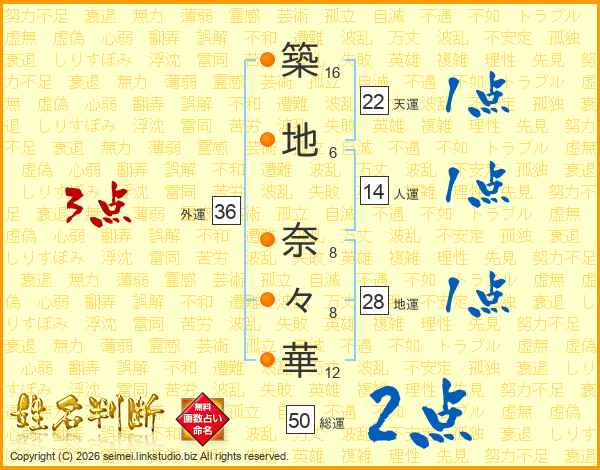 築(16画)地(6画) 奈(8画)々(8画)華(12画)