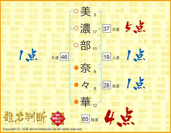 美(9画)濃(17画)部(11画) 奈(8画)々(8画)華(12画)