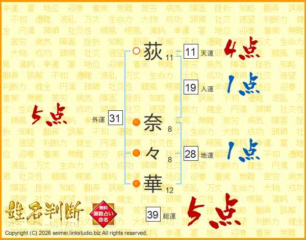 荻(11画) 奈(8画)々(8画)華(12画)