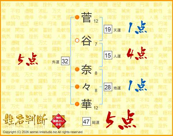 菅(12画)谷(7画) 奈(8画)々(8画)華(12画)