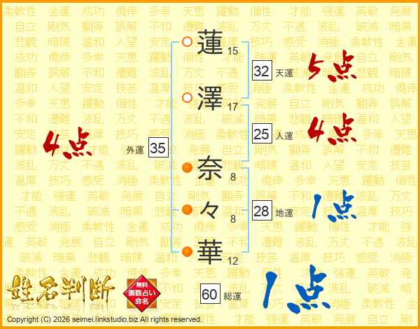 蓮(15画)澤(17画) 奈(8画)々(8画)華(12画)