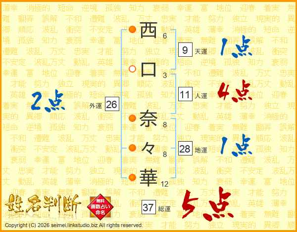 西(6画)口(3画) 奈(8画)々(8画)華(12画)