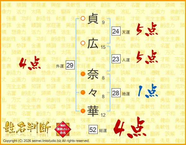 貞(9画)広(15画) 奈(8画)々(8画)華(12画)