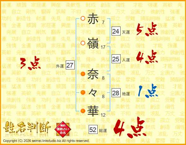 赤(7画)嶺(17画) 奈(8画)々(8画)華(12画)