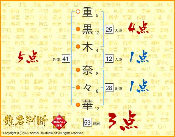 重(9画)黒(12画)木(4画) 奈(8画)々(8画)華(12画)