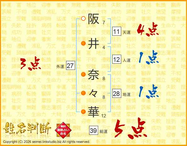 阪井奈々華さんの総運は39画の5点!
