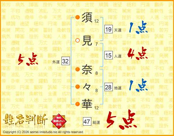 須(12画)見(7画) 奈(8画)々(8画)華(12画)