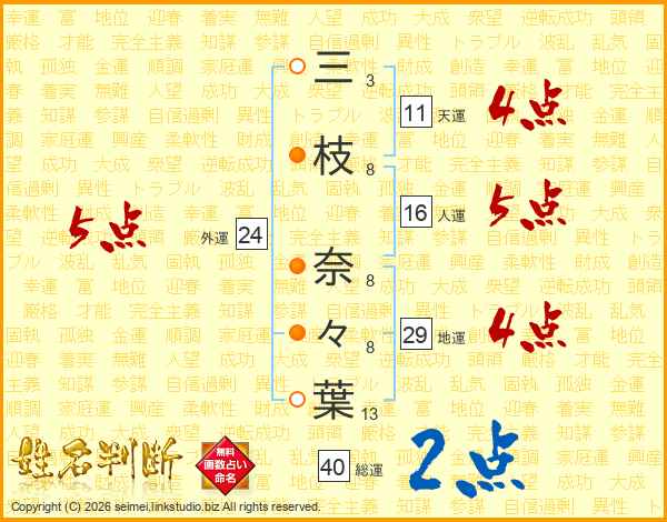 三(3画)枝(8画) 奈(8画)々(8画)葉(13画)