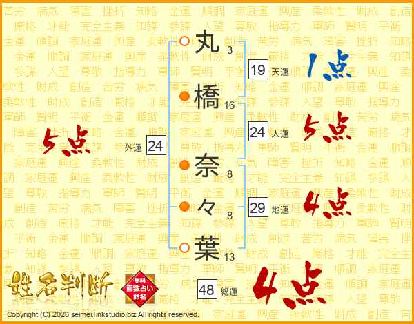 丸(3画)橋(16画) 奈(8画)々(8画)葉(13画)