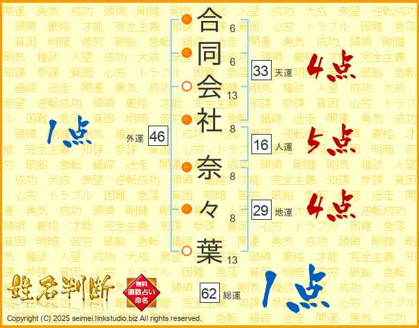 合(6画)同(6画)会(13画)社(8画) 奈(8画)々(8画)葉(13画)