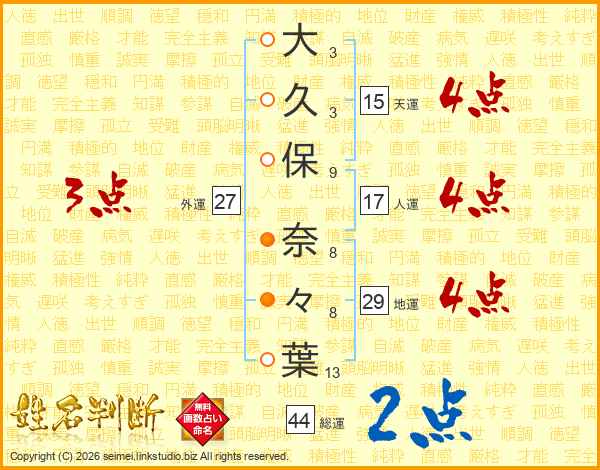 大(3画)久(3画)保(9画) 奈(8画)々(8画)葉(13画)