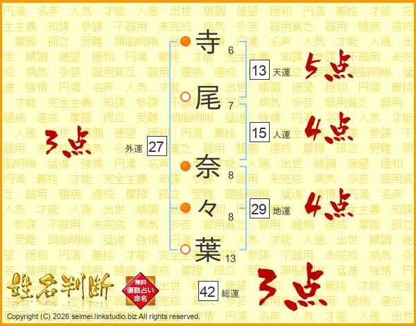 寺(6画)尾(7画) 奈(8画)々(8画)葉(13画)