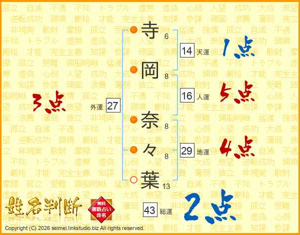 寺(6画)岡(8画) 奈(8画)々(8画)葉(13画)