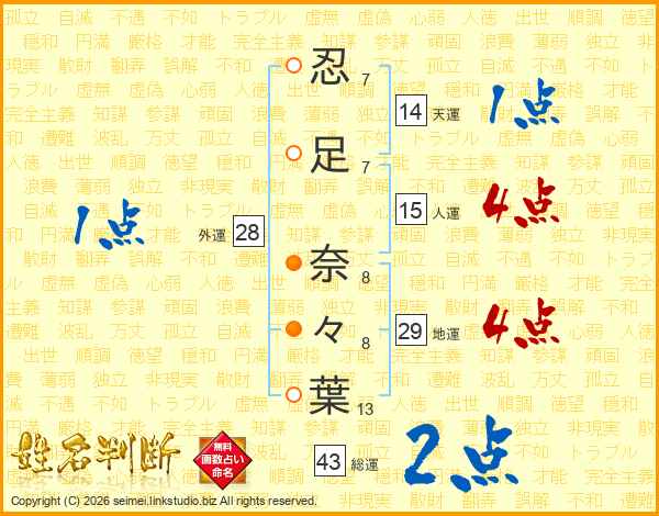 忍(7画)足(7画) 奈(8画)々(8画)葉(13画)