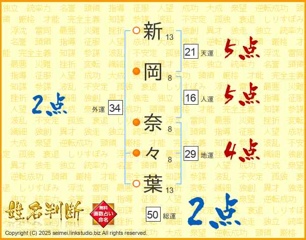 新(13画)岡(8画) 奈(8画)々(8画)葉(13画)