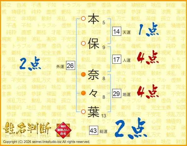 本(5画)保(9画) 奈(8画)々(8画)葉(13画)