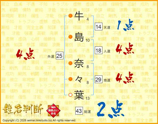 牛(4画)島(10画) 奈(8画)々(8画)葉(13画)