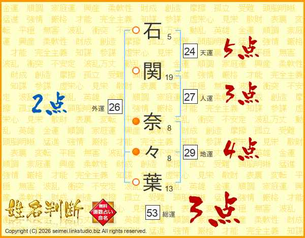 石(5画)関(19画) 奈(8画)々(8画)葉(13画)