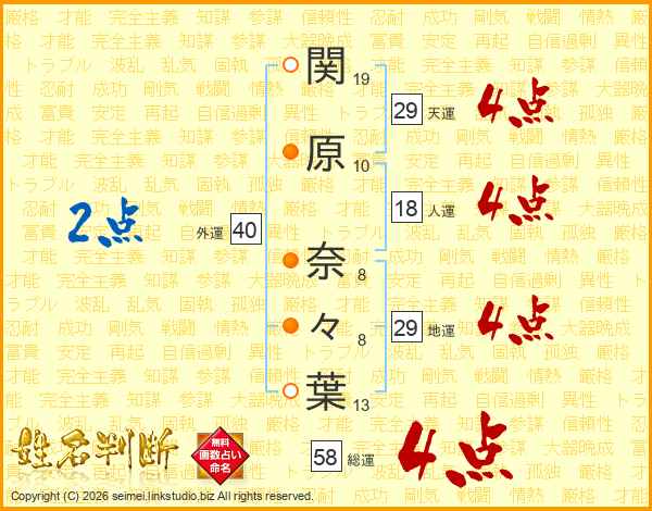 関(19画)原(10画) 奈(8画)々(8画)葉(13画)
