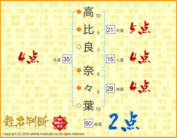 高(10画)比(4画)良(7画) 奈(8画)々(8画)葉(13画)