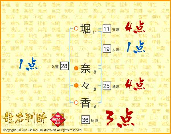 生活面を象徴する運勢です。外部から受ける影響力を表し、結婚運、家庭運や職場、環境への順応性を表します。総運から人運を引いた画数。姓や名が1文字の場合を除く。