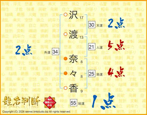 沢(17画)渡(13画) 奈(8画)々(8画)香(9画)