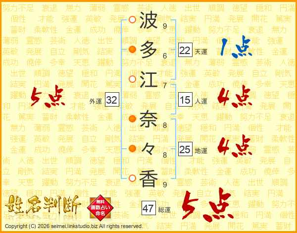 波(9画)多(6画)江(7画) 奈(8画)々(8画)香(9画)