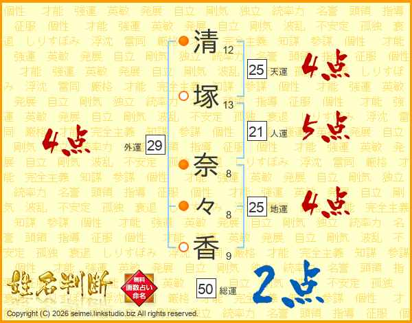 清塚奈々香さんの天運は25画の4点!