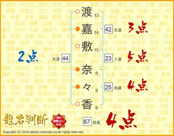 渡(13画)嘉(14画)敷(15画) 奈(8画)々(8画)香(9画)