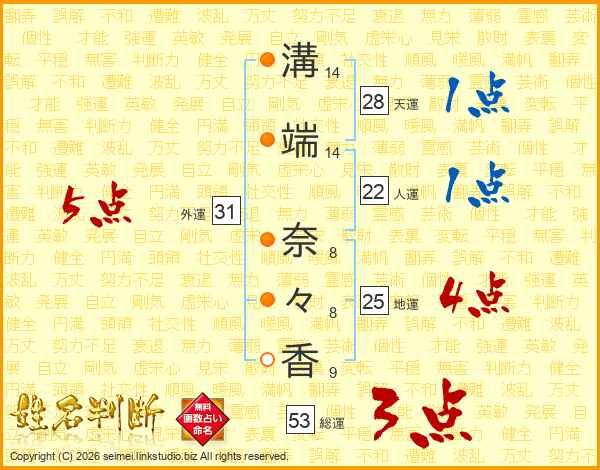 溝(14画)端(14画) 奈(8画)々(8画)香(9画)