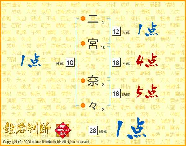 二(2画)宮(10画) 奈(8画)々(8画)
