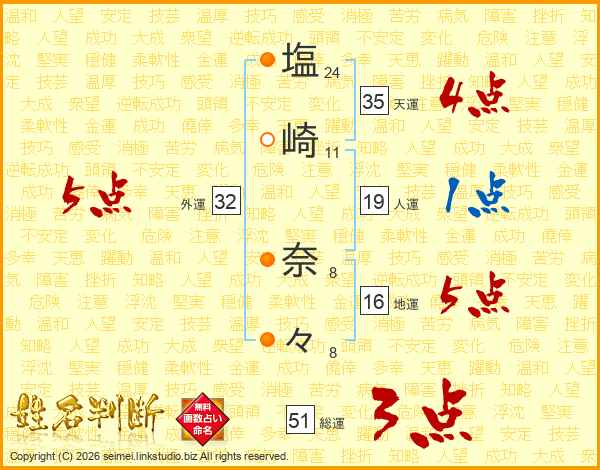 塩崎奈々さんの総運は51画の3点!