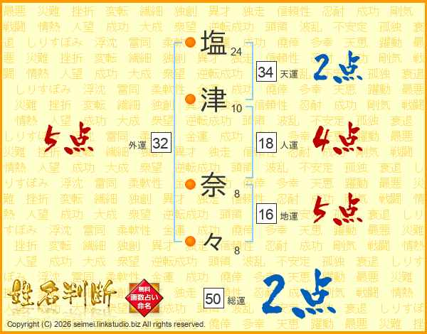 塩(24画)津(10画) 奈(8画)々(8画)