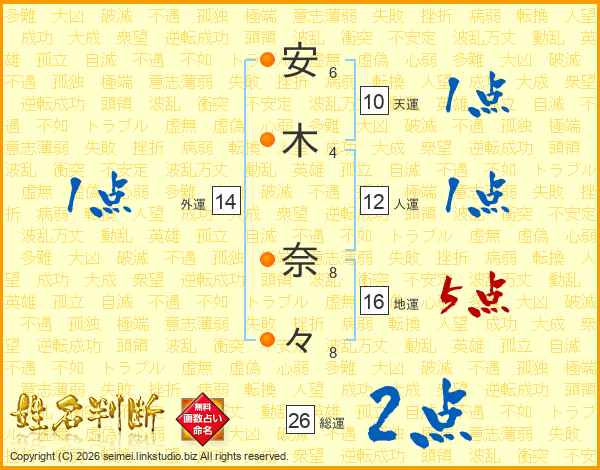 あなたの人生を表す1番重要な運勢です。生涯を通じて影響する総合運となり、主に50歳以降の晩年期に影響を及ぼします。苗字と名前の合計画数。