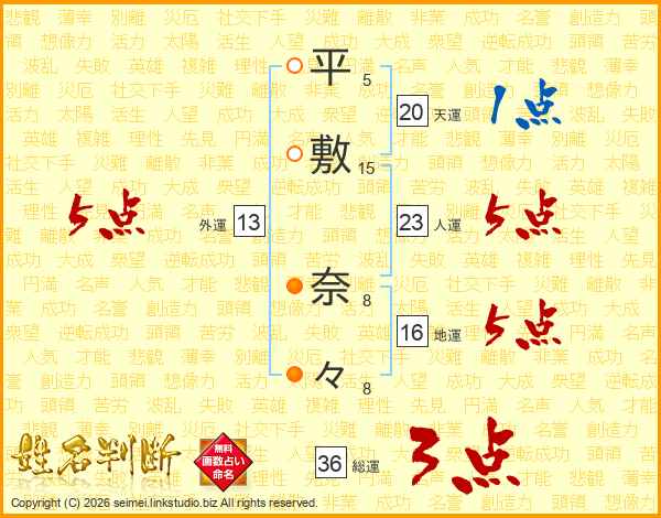 平(5画)敷(15画) 奈(8画)々(8画)