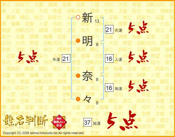 生活面を象徴する運勢です。外部から受ける影響力を表し、結婚運、家庭運や職場、環境への順応性を表します。総運から人運を引いた画数。姓や名が1文字の場合を除く。