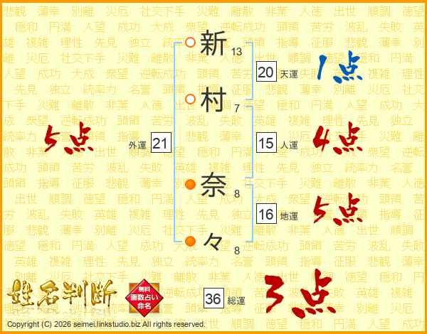 新(13画)村(7画) 奈(8画)々(8画)
