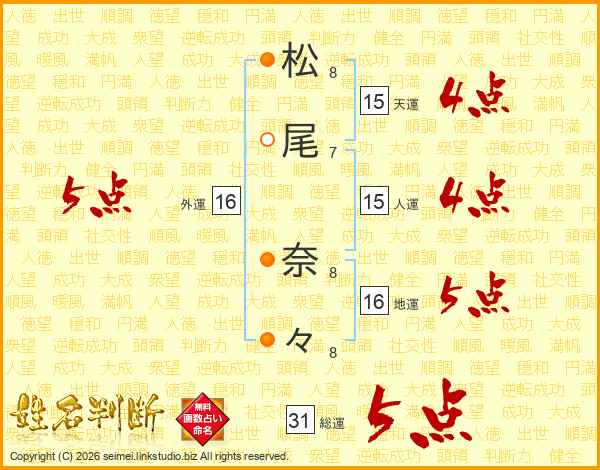 松(8画)尾(7画) 奈(8画)々(8画)