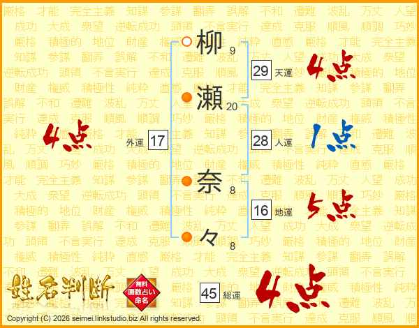柳瀬奈々さんの総運は45画の4点