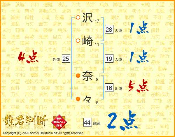 沢(17画)崎(11画) 奈(8画)々(8画)