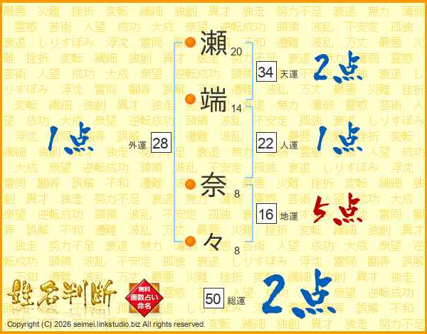 瀬端奈々さんの総運は50画の2点!