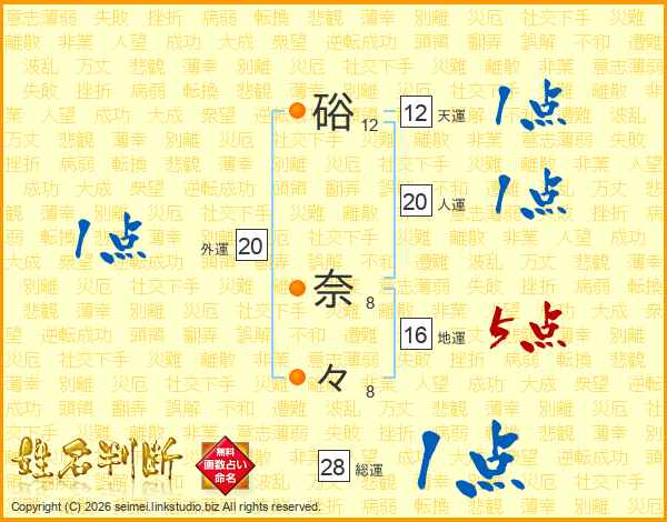 生活面を象徴する運勢です。外部から受ける影響力を表し、結婚運、家庭運や職場、環境への順応性を表します。総運から人運を引いた画数。姓や名が1文字の場合を除く。