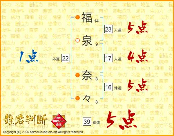 生活面を象徴する運勢です。外部から受ける影響力を表し、結婚運、家庭運や職場、環境への順応性を表します。総運から人運を引いた画数。姓や名が1文字の場合を除く。