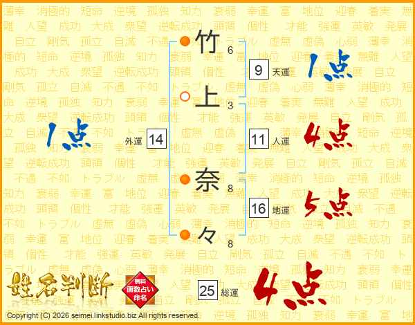 生活面を象徴する運勢です。外部から受ける影響力を表し、結婚運、家庭運や職場、環境への順応性を表します。総運から人運を引いた画数。姓や名が1文字の場合を除く。
